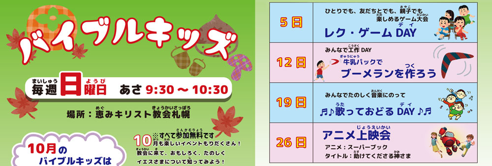 ○ 小学生礼拝・バイブルキッズ☆毎週日曜9:30〜10:30にやってるよ きてね!10月のフライヤーだよ!